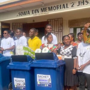 The African Foundation For Climate Change and Sustainable Development (AFCCSD), in collaboration with T-Del Foundation and Eco-Innova Foundation, has donated waste bins to Sowa Din Memorial Two JHS School at Ashale Botwe in Accra as part of renewed efforts to promote sanitation and climate consciousness in Ghana’s basic schools.