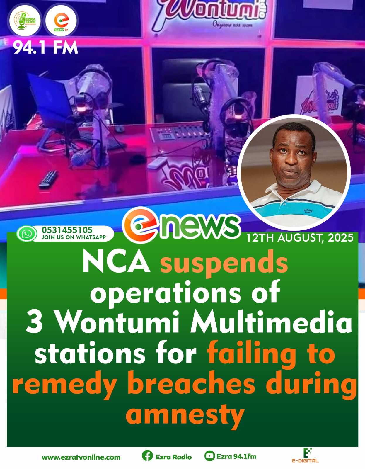 The National Communications Authority (NCA) has taken decisive action against Wontumi Multimedia Company, suspending its operating licences and ordering an immediate halt to all broadcasting activities in Accra, Kumasi, and Takoradi.