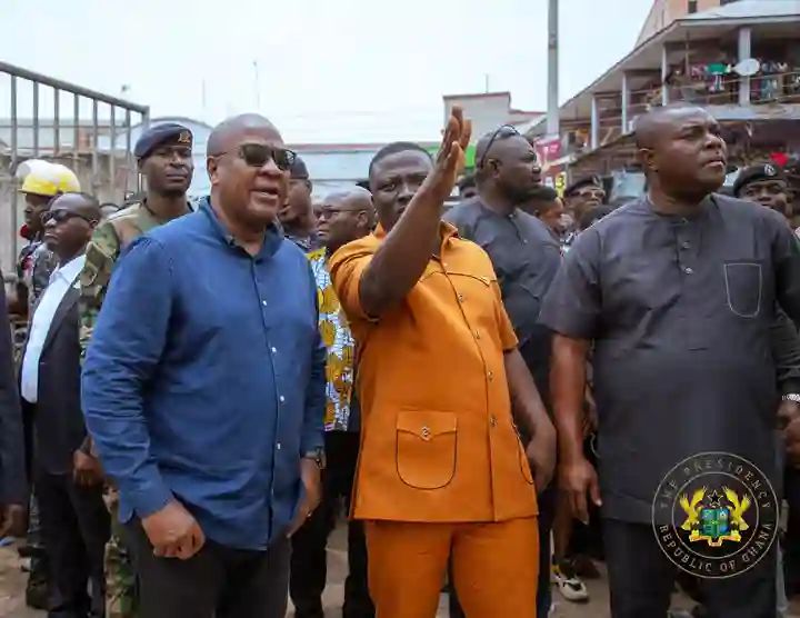 President John Dramani Mahama visited the scene of a devastating fire in Adum-Kumasi, a central business district in the Ashanti Region. The fire, which occurred on Friday, March 21, destroyed hundreds of shops, leaving traders distraught.